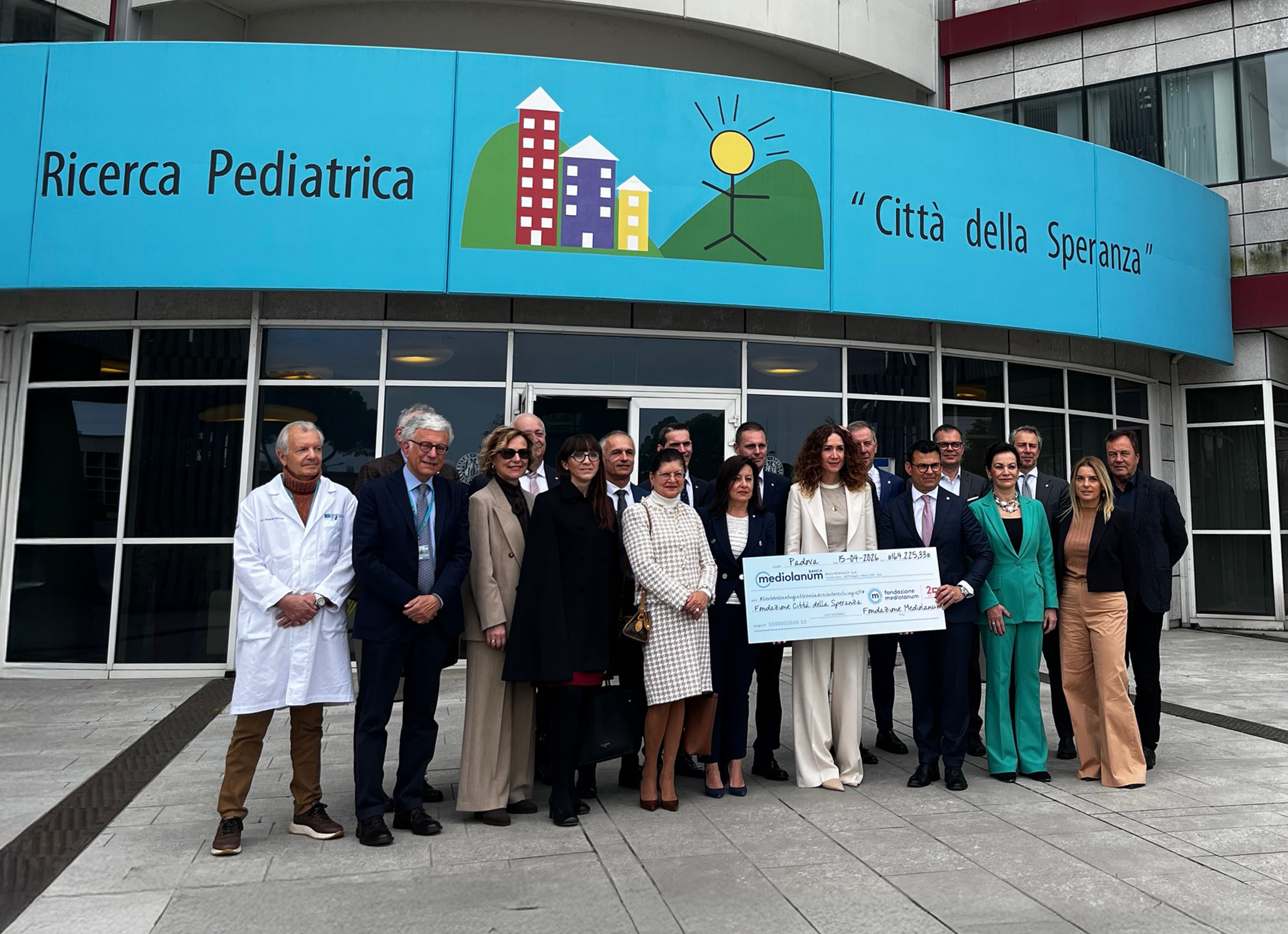 Presenti alla cerimonia di consegna, presso l’Istituto di Ricerca Pediatrica Città della Speranza di Padova, il Fondatore di Città della Speranza e Presidente IRP Franco Masello e la Presidente di Fondazione Mediolanum e vicepresidente di Banca Mediolanum, Sara Doris.